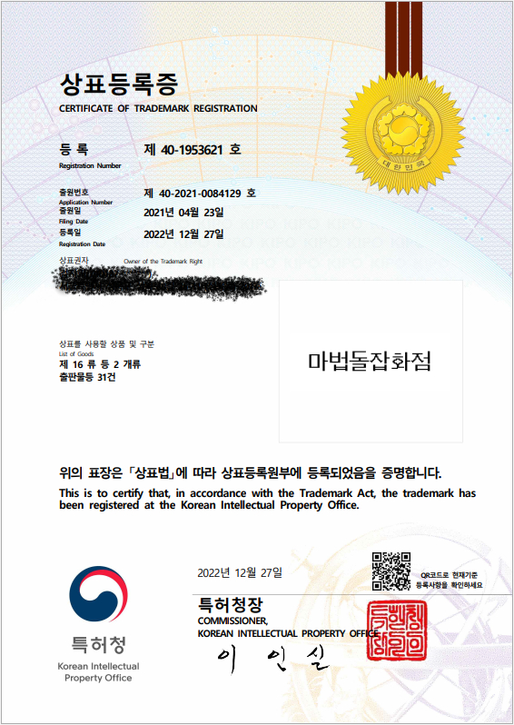 이야기 상자의 예술상 상점명 마법돌잡화점이 상표등록증을 받았습니다.