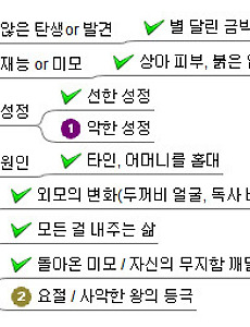 책30 [책요약] 반갑다, 논리야 반갑다 논리야(이야기로익히는논리학습 1) 카테고리 아동 지은이 위기철 (사계절, 1992년) 상세보기 이 시리즈는 논리에 대한 쉬운 해석을 도모하는 아주 훌륭한 책이었슴죠.ㅋㅋ 예전에 얼핏 봤던 기억은 있는데 이번에 새로이 읽어봤슴돠. 여전히 쉽고, 여전히 명쾌하네여.^^ 아래 정리한 건 제멋대로, 제 입맛대로 정리라서리 이런 글투 절대 아님돠... 그냥 제2의 뇌 저장소 정도로...ㅋㅋㅋ 앞으로는 책 읽으면 리뷰를 쓰던가 요약을 하던가 꼭 해야 겠어여. 잘 남는 것 같아여. 내 어딘가에.... 머리만은 아닌 것 같고... 그랬으면 천재될텐데...음훼훼~! 책표지 이미지는 다음(http://www.daum.net)에서 가져왔슴돠~! 요약시작~!----------------------------------.. 2010. 6. 7. 오스카 와일드 환상동화의 독특한 매력 오스카 와일드 환상동화 카테고리 소설 지은이 오스카 와일드 (이레, 2008년) 상세보기 오스카 와일드는 심미주의의 대가이자 각종 스캔들의 대가이기도 하고 이야기의 정석을 빗겨나가기로도 유명한 듯. 그가 쓴 환상동화는 동화이되 왠지 어른이 봐줘야 할 것 같은 동화들. 9개의 동화 중 두편만 오픈소스 마인드맵인 freemind으로 그려보았다. [별아이]의 경우, 보통의 시작에서 결말에 이르기까지 두가지의 변주가 있는 것 같다. 주인공인 별아이는 범인과 다른 행보를 보이지만 다만 다른 점이 있다면 성격이 더럽다는 점.ㅋㅋ 그의 시련은 자신의 문제, 즉 성격이라는 토대로 인해 발생하고, 그로 인한 벌은 그의 특출난 점인 외모의 변화를 통해 나타난다. 이 점을 제외하고는 착해진 별아이가 왕이 되는 권선징악적 루.. 2010. 5. 31. 오랜만에 책 요약 - 프로이트처럼 생각하고 스키너처럼 행동하라 아주 오랜만에 책 요약. 예전엔 이런 거 정리해서 웹에 올리는 사람도 종종 있었는데, 요즘은 찾아볼 수 없는 듯. 왜일까나? 다들 근사한 리뷰어가 된 덕일까나? 아니면 마음을 울리는 책이 없어서? 책을 읽지 않아서? 요약이란 거 쓸데없어서? 사실 사람의 심리를 무 자르듯 조각내서 정의하는 건 참 어려운 일이지만, 꽤 잘 잘라서 배치한 듯. 하지만 약간 용두사미. 뒤로 갈수록 약하다. 번역 잘 하는 언니에게 물어보니 번역은 별로인 듯.=,= 프로이트처럼 생각하고 스키너처럼 행동하라 카테고리 인문 지은이 제러미 딘 (부글북스, 2008년) 상세보기 [1] 기억의 7가지 죄악 ‘우리라는 존재는 경험과 기억의 축적이다. 인간됨됨이는 부분적으로 우리에게 일어난 일들의 집합이다.’ (1) 망각 - 기억의 부재 1... 2010. 5. 23. 이상한 나라에 가는 연령의 상승 - 이상한 나라의 앨리스와 집으로 돌아가는 길 책 [집으로 돌아가는 길]과 최근 개봉한 영화 [이상한 나라의 앨리스]의 공통점? 이상한 나라의 앨리스 감독 팀 버튼 (2010 / 미국) 출연 조니 뎁, 미아 와시코우스카, 헬레나 본햄 카터, 앤 헤더웨이 상세보기 집으로 돌아가는 길 카테고리 소설 지은이 김이환 (디앤씨미디어, 2010년) 상세보기 책 [집으로 돌아가는 길]은 판타지소설작가 김이환씨의 신작으로, 원래대로라면 10세 전후로 가봤어야할 꿈의 세계로 17세에 날라가게된 소년의 이야기. 여기서 꿈의 세계는 어린이라면 누구나 거쳐야하는 성장의 과정인데, 해리포터를 연상할만큼 오래 걸리고 고통스러운 것이었다. 어린이가 자신의 꿈을 모두 내어놓고 돌아가야 하는 그곳. 그곳에서 어린이들은 최소 3년이상은 지내야 하는 곳이다. 결국 제 나이의 현실로 .. 2010. 3. 29. 책 [지속가능한 딴따라질]을 샀어요! 붕가붕가레코드의 지속가능한 딴따라질 카테고리 시/에세이 지은이 붕가붕가레코드 (푸른숲, 2009년) 상세보기 이대 안의 아트하우스 모모 옆에 있는 카페에서 커피와 세트로 팔던데요. 혼자 힘으로 살아가는 청춘의 일 전형은 무엇일지.. 차근차근 살펴보려고요..ㅋㅋ 2010. 2. 2. [遡及] 책 '암살주식회사' * 우와~ 벌써 2006년 10월에 썼던 거네여. 오래됐당...=.= --------------------------------------------------------------------- 잭 런던의 장편 소설이되 잭 런던만의 장편소설이라하기엔 좀. 쓰다 만걸 후대의 로버트 피쉬가 완성시켜놓았다. 하지만 상관없다. 뒷 부분은 스릴러일 뿐이다. 사실 이 소설이 보여줄 수 있는 모습은 앞부분에 촘촘히 다 짜여져있다. 그가 -비록 완성하지 못했으나- 썼던 이 소설은 꽤 의미심장하다. 암살 주식회사 카테고리 소설 지은이 잭 런던 (문학동네, 2005년) 상세보기 내용은 간단하다. 옛 맑스주의자들이 만든 암살단. 주로 들어오는 의뢰는 뭔가 꾸미려하지만 항상 어설퍼서 실패하고마는 아나키스트들 대신 사회의 악을.. 2010. 1. 29. 이전 1 2 3 다음